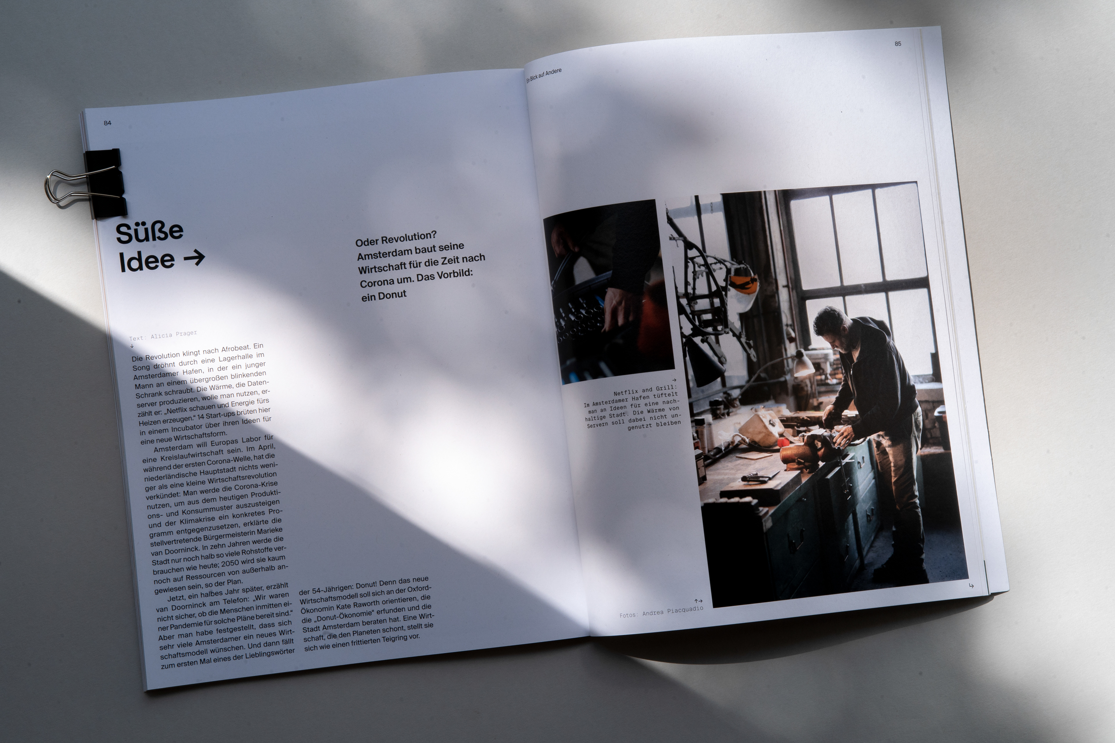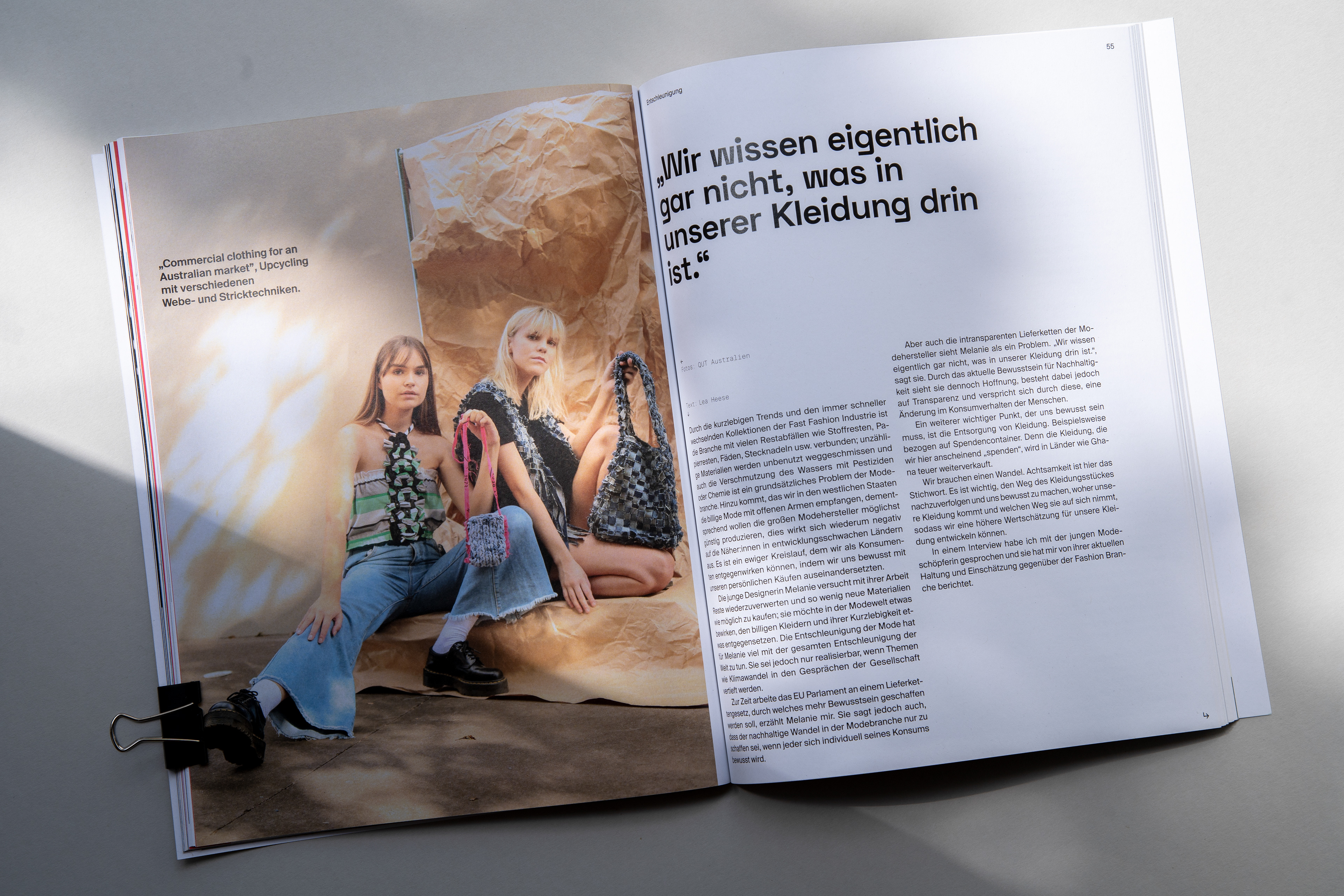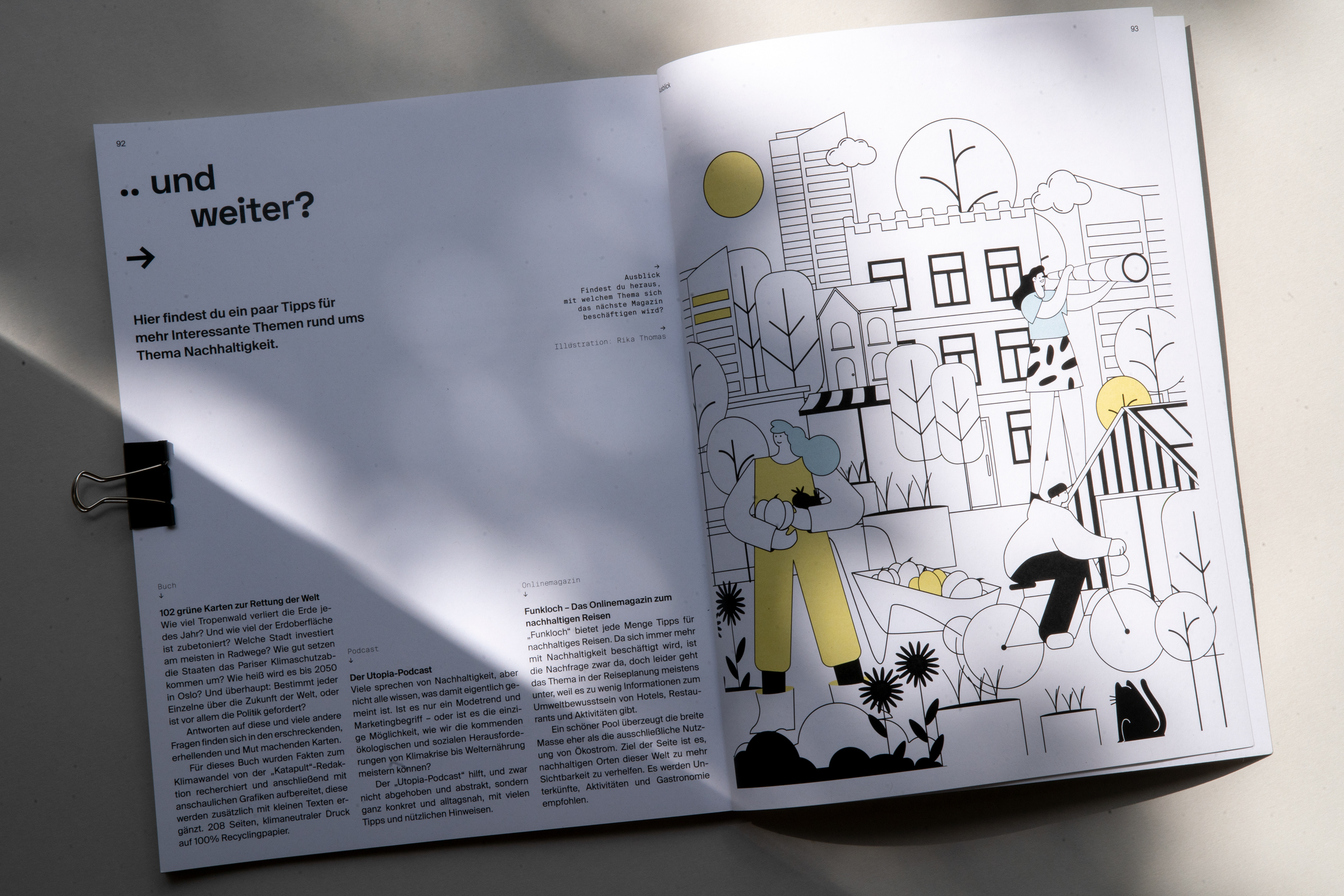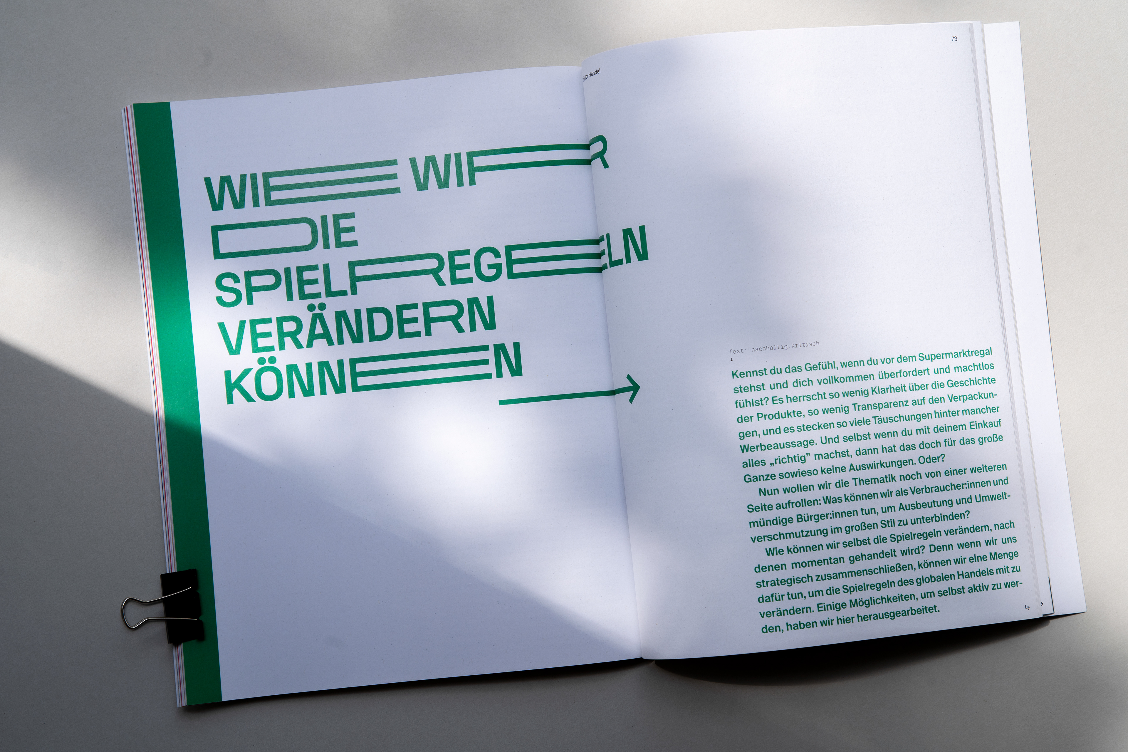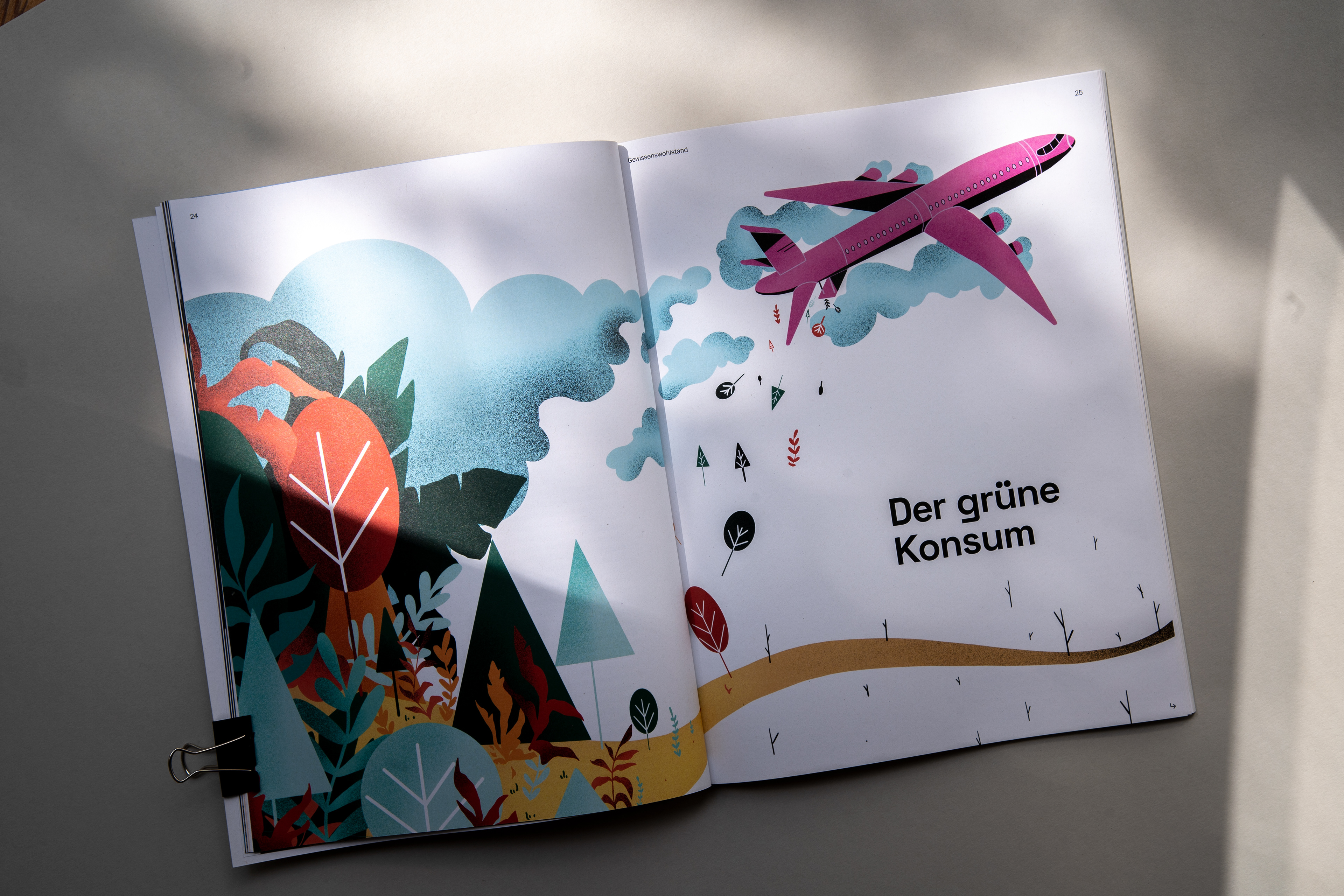 Magazin für Nachhaltigkeit und gesellschaftlichen Wandel Die Liebe zum Print und analogen Arbeiten, sowie das Thema Klimawandel und nachhaltiges Handeln begleiten und beschäftigen mich schon seit Beginn meines Studiums. In meiner Diplomarbeit habe ich deshalb beide Bereiche miteinander verbunden und das rund 94 Seiten Magazin „fortan“ entwickelt, gestaltet und umgesetzt. Dabei habe ich nicht nur die gesamte Gestaltung, inklusive Fotografien und Illustrationen, sondern auch die redaktionelle Auswahl der Texte, sowie das Entwickeln von neuen Inhalten übernommen. Der Titel soll eine Motivation zum Handeln sein und richtet sich auf die Zukunft. Die Bewegung in dem Namen „fortan“ vermittelt dem Lesenden Eigeninitiative zu ergreifen und sofort zu handeln. Ziel der Arbeit ist es, Menschen über das Thema Klimawandel aufzuklären, ohne sie dabei abzuschrecken. Dadurch soll der eigene Wandel nicht als Zwang, sondern als eine Chance wahrgenommen und verstanden werden. Das Magazin bietet eine Richtung in der Flut der tätlichen Eindrücke und Meinungen und hilft dadurch nicht nur Neueinsteiger:innen, sondern auch aktiven Klimainteressent:innen bei der thematischen Orientierung.